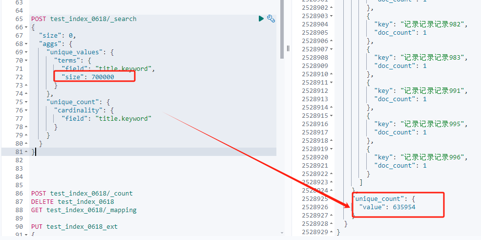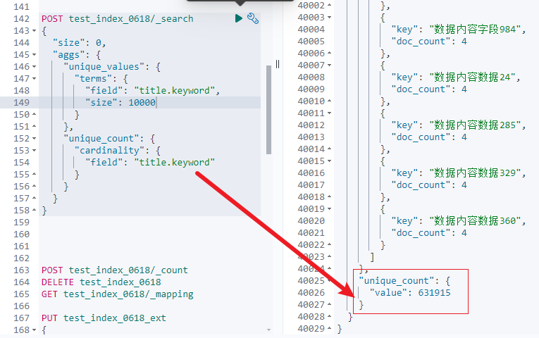 如下查询通过terms聚合获取title.keyword字段的前10000个唯一值,并使用cardinality聚合计算该字段的唯一值总数。