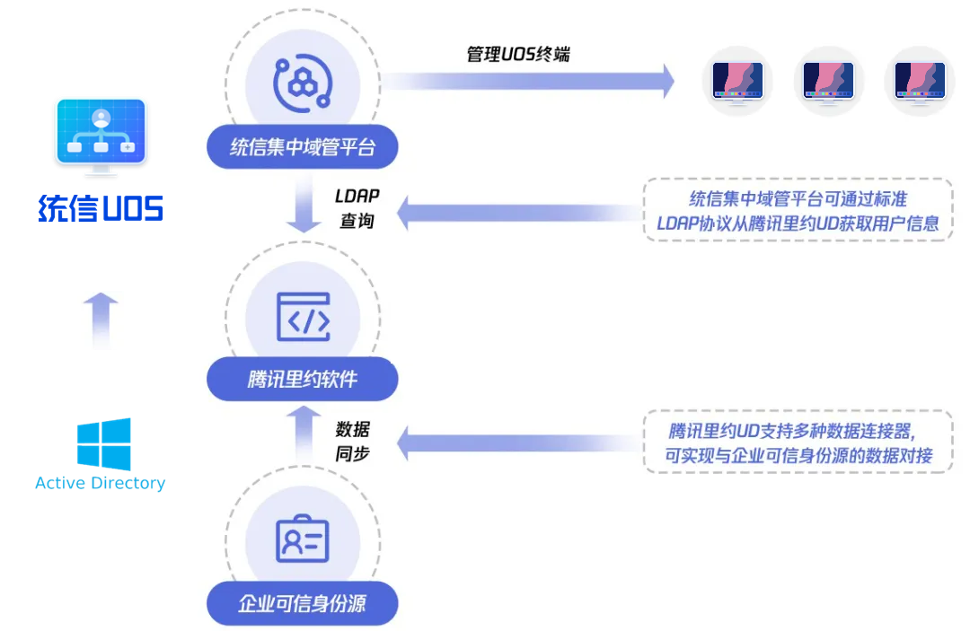 近日,统信软件联合腾讯云发布的国产终端域管解决方案,融合统信集中域管平台与腾讯里约优势,为客户提供集中身份管理和终端运维管理场景提供的整体解决方案,助力企业在国产化和数字化转型的道路上建立统一身份及终端管控平台,实现信创终端与企业信息化生态的无缝融合,从原有非信创基础设施(如AD域、文件服务器等)的平滑迁移。