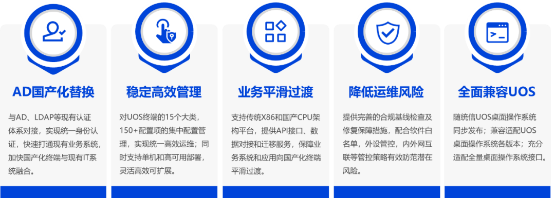 统信集中域管平台,作为统信UOS桌面操作系统的基础服务基座,实现对统信UOS的集中管理与运维,提升终端管控运维效率的同时又能降低成本投入。通过统一身份认证、人员与终端管理、身份权限管控、系统更新与补丁管理、软件部署与管理、桌面策略配置、审计与报表等核心业务功能,统信集中域管平台可全面覆盖终端运维的各种场景。