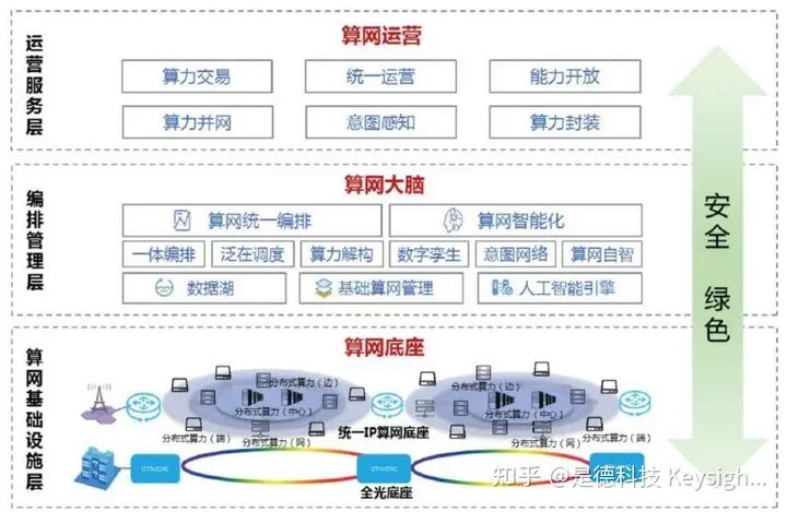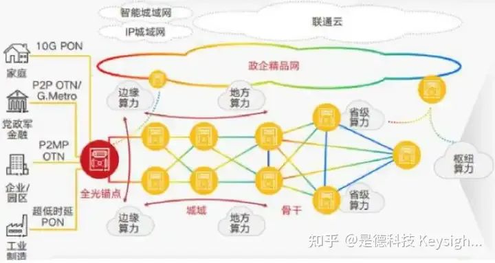 当前网络实现了全光底座,有管道特性,具备高品质连接能力。但社会信息化加速、新兴 应用涌现,光网络架构复杂、适应性差、智能化弱,需要由带宽驱动管道化网络向业务与体验 驱动的算力网络演进。算力网络需具备智能化、低时延、低抖动、低丢包、大带宽、高可靠等特点。从建设“尽 力满足需求”的传统网络转型到建设“提供高品质业务”的算力网络已提上日程。结合国家“东数 西算”工程与“全国一体化大数据”规划,加速算力网络建设。下图展示的是中国联通全光底座的算力网络架构。数据中心规划方面,建设靠近用户的全 光锚点,部署边缘算力,提高用户体验;部署地方、省级算力实现地市、城市群算力统筹调 度;建设枢纽算力实现东、西部算力资源协调。网络时延方面,西部枢纽到东部远距离枢纽可 控制在小于 20ms,省与市数据中心可控制在 5ms 以内,光锚点与市数据中心可控制在 1ms 以内。计算能力方面, 数据中心拥有大量服务器和加速卡,可提供丰富算力资源。