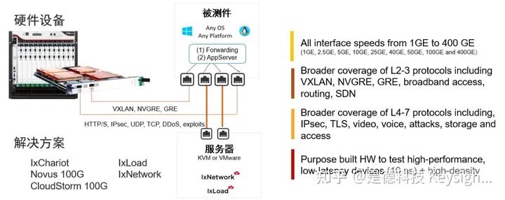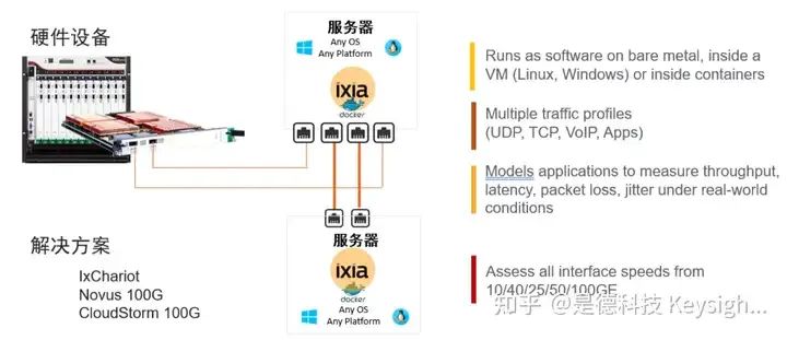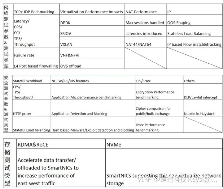 因为 DPU 卡具备网络接口,支持 OSI 七层网络模型, 内嵌协议栈。是德 Novus 100G 平台有 5 种速率等级,支持无状态业务生成,CloudStorm 也 有 5 种速率等级支持有状态业务生成,实现网络测试。另外也有可安装在硬件服务器上的 IxChariot 软件,实现轻量级业务模拟,进行网络测试。另外安全测试还需额外的 IxLoad 软件实现有状态实际应用模拟与线程模拟,需要 IxNetwork 软件实现无状态业务模拟、虚拟化验证等功能。