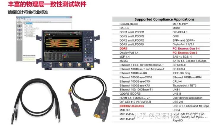 发送端物理层一致性测试以高性能实时示波器平台为主。支持芯片及板卡物理层信号质量 测试。参考下图,UXR 系列实时示波器可搭配同轴线缆借助自动化软件 D9010EBSC 按照 IEEE 802.3bs/cd 标准完成 C2C、C2M、CR/CR2/CR4、KR/KR2/KR4 测试,借助 D9010CKCA 按照 IEEE 802.3 CK 标准完成 C2C、C2M、CR、KR 等物理层一致性测试,借 助自研测试板或 PCI-SIG 协会夹具完成 PCIE1.0~5.0 Base/CEM 物理层一致性测试,借助探 头搭配 interposer 转接板完成 DDR5 物理层一致性测试。