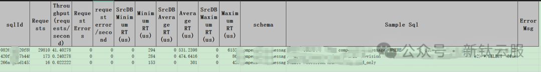 sqlId:sql指纹requests:请求总数Throughput (requests/second):每秒吞吐Request Errors:请求失败数request error/second:每秒请求失败数SrcDB Minimum RT(us):原库最小耗时Minimum RT(us):目标库最小耗时,包含网络耗时和jdbc处理耗时SrcDB Average RT(us):原库平均耗时Average RT(us):目标库平均耗时,包含网络耗时和jdbc处理耗时SrcDB Maximum RT(us):原库最大耗时Maximum RT(us):目标库最大耗时,包含网络耗时和jdbc处理耗时schema:目标库回放schemaSample sql:sql示例Error Msg:报错信息概要