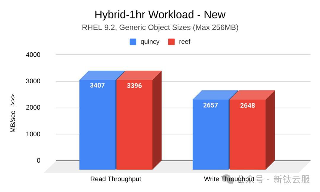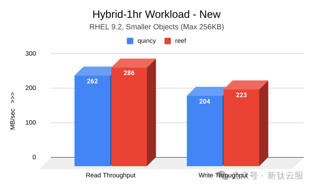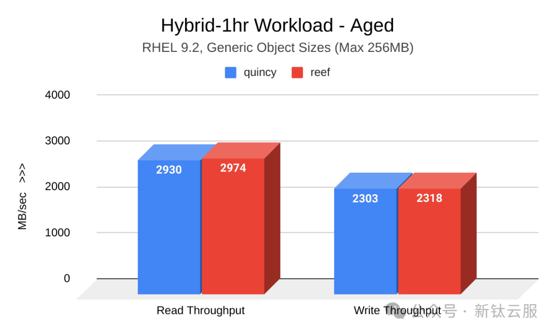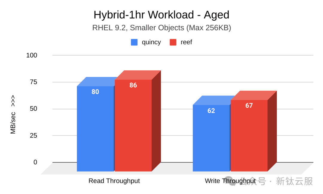 下图展示了集群老化后Quincy(蓝色)和Reef(红色)的读写吞吐量(MB/秒)对比。Quincy 显示出显着改善: