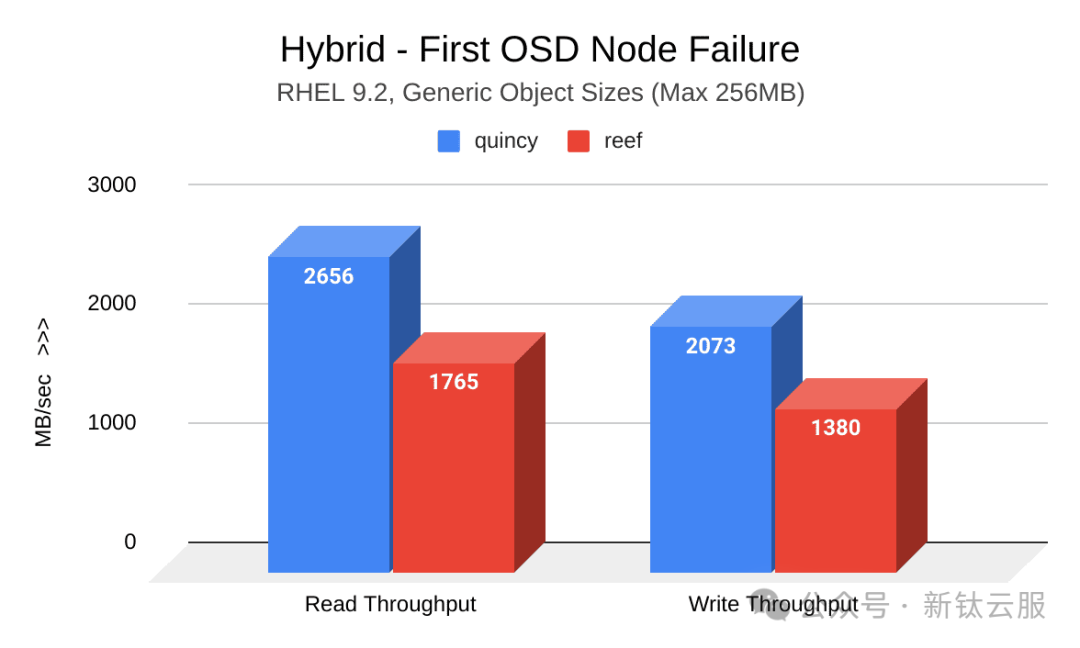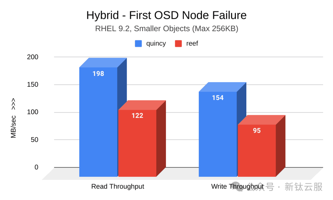 虽然诱发OSD节点故障的工作负载显示Reef 的吞吐量有所下降,但由于恢复时间大幅缩短,因此损失 也随之减少。
