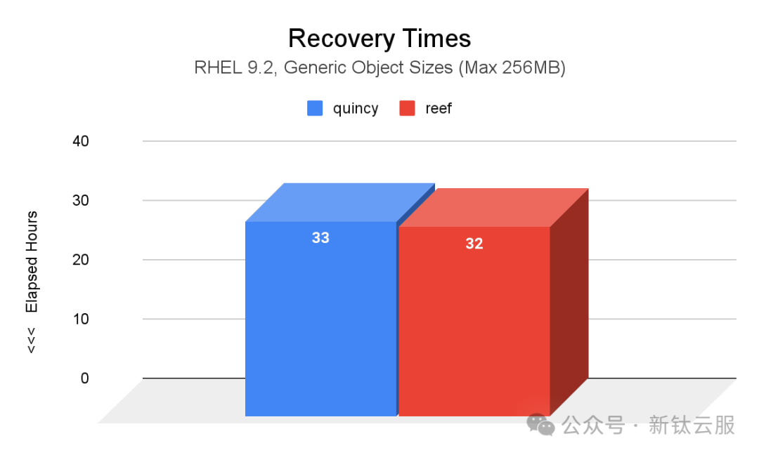 下图显示了两次引发的 OSD 节点故障后 Quincy(蓝色)和 Reef(红色)之间的恢复时间(小时)比较。与 Quincy 相比,Reef 中的 PG 达到 active+clean 状态所需的时间减少了1小时。