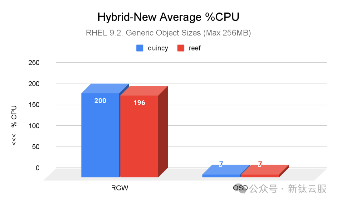 最明显的差异如下图所示,这是 Quincy(蓝色)和 Reef(红色)在新集群中使用通用对象大小时 CPU 平均使用百分比的比较。与 Quincy 相比,Reef 的 RGW CPU 占用率略有提高。