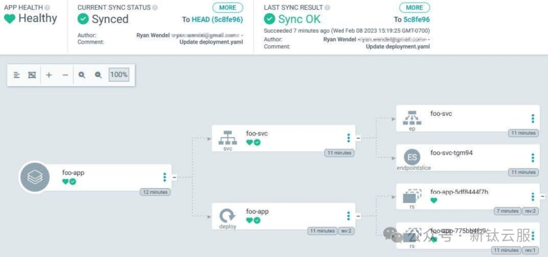 “foo-app”应用程序现在应该正在运行中。你可以查看其资源组件、日志、历史记录和评估的健康状态。