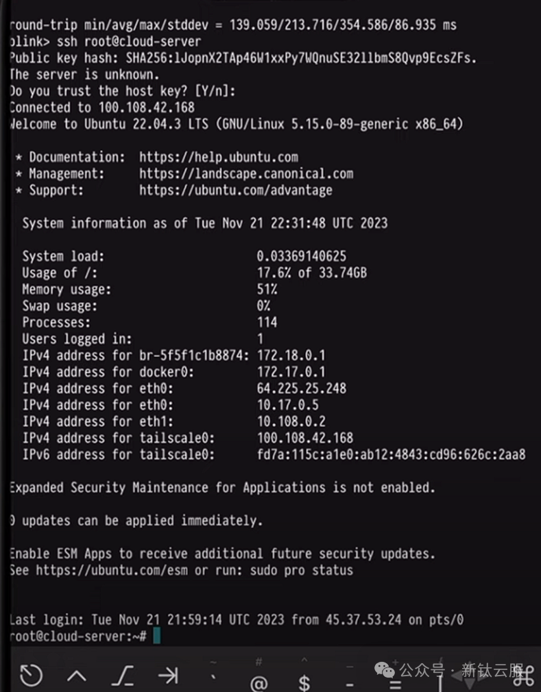 接下来使用tailscale set --ssh 使得ssh功能可以添加到tailscale服务器,从而可以在任意端上远程登陆,以手机端为例,操作效果如下