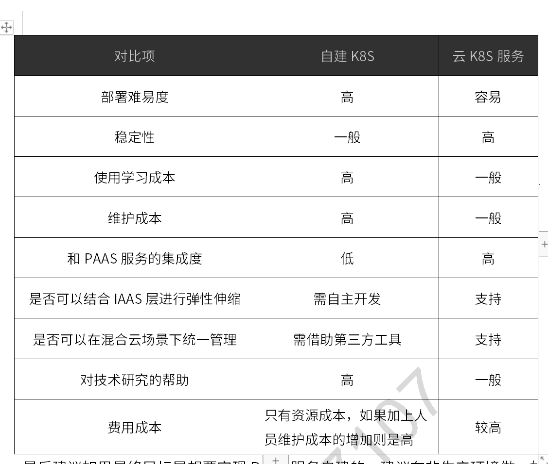 K8S平台无论你用云上的还是自建的,其底层都是一样的。云上的服务会比自建的多一个管理界面,让管理K8S平台变得更容易。在实际生产过程中,我们也很少需要登录到Master节点上去进行命令行操作。发布可以通过统一的发布平台,看日志排错可以通过统一的日志平台。只有极少数的紧急突发情况需要登录到K8S的容器环境里去进行生产的直接调试排错。因为整个K8S环境是面向所有服务的,所以要尽可能的避免直接登录到K8S服务器上进行操作。然后回到对比这个问题的本身,个人认为云上的服务比自建要好。云上优势如下:云上K8S服务除了不需要你部署之外,产品自身出现问题均有客服帮你解决。且自带的管理界面基本满足日常的配置需求。如果你要和NAS或其它PAAS服务做集成,那肯定是用云上的更方便,如果是自建的会有一定的定制开发成本甚至完全无法集成都有可能。稳定性为什么会比自建高呢?因为自建的是面向所有大众的哪怕有人踩过了坑但他解决后不提交问题,所以这个问题仍然存在未被修复。而云上的只要有人反馈必定会被解决,而且厂商肯定会想办法修复这些问题避免其它客户踩坑。不要小看这个优势,也许有一天他是你业务能快速恢复的救命稻草。根据选择的版本不同会有价格的差异,部分版本会收取额外的平台增值费用。案例1:某服装电商K8S选型历程