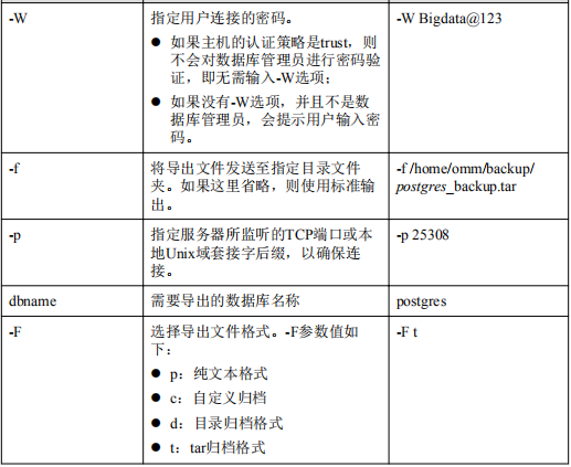 gs_dump -W Bigdata@123 -f /home/omm/backup/MPPDB_backup3.dmp -p 25308 human_resource -t public.* -t hr.staffs -F c