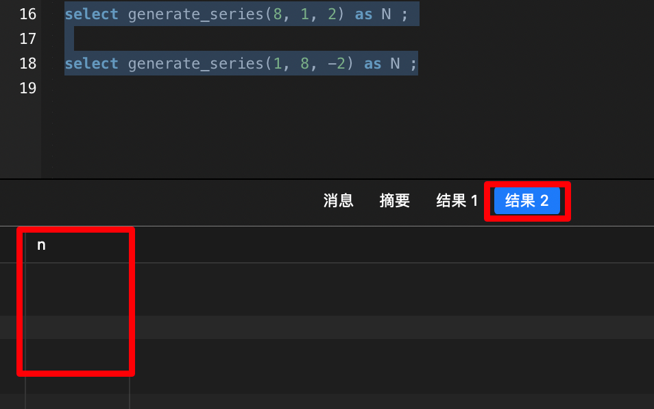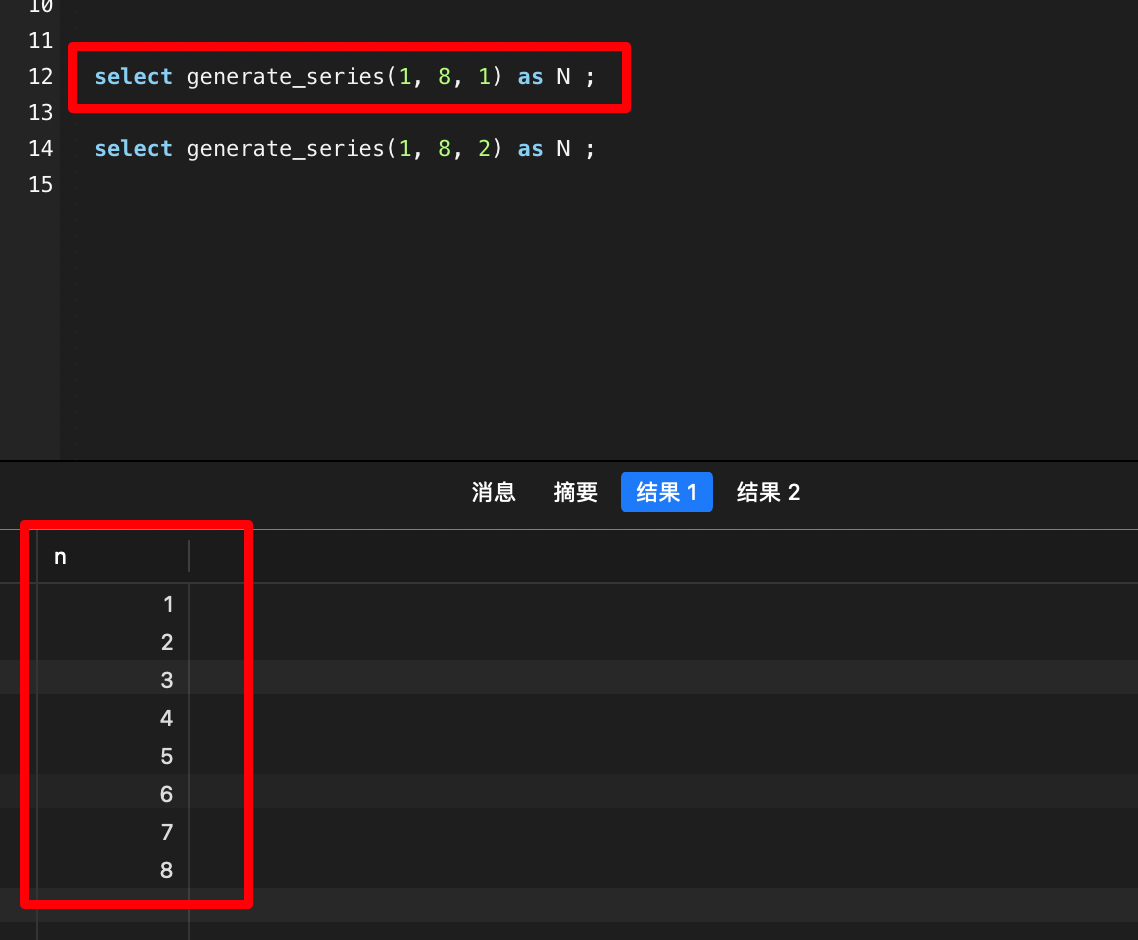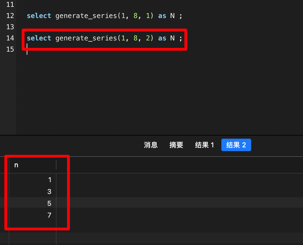 select generate_series(8, 1, -2) as N ;2.3 注意
