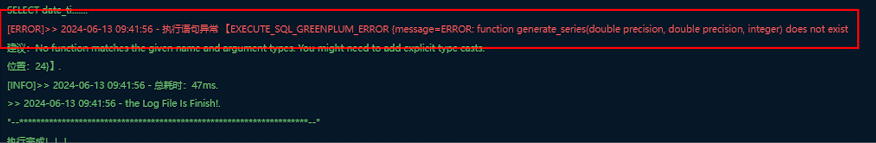[ERRORI>> 2024-06-13 09:41:56-执行语句异常【EXECUTE SOL GREENPLUM ERROR{message=ERROR: function generate_series(double precision, double precision, integer) does not exist}