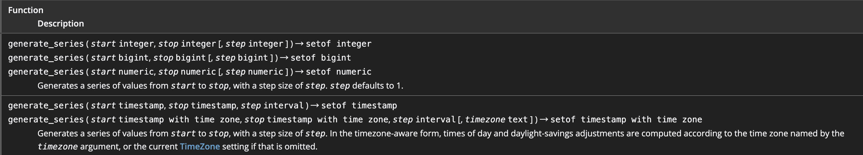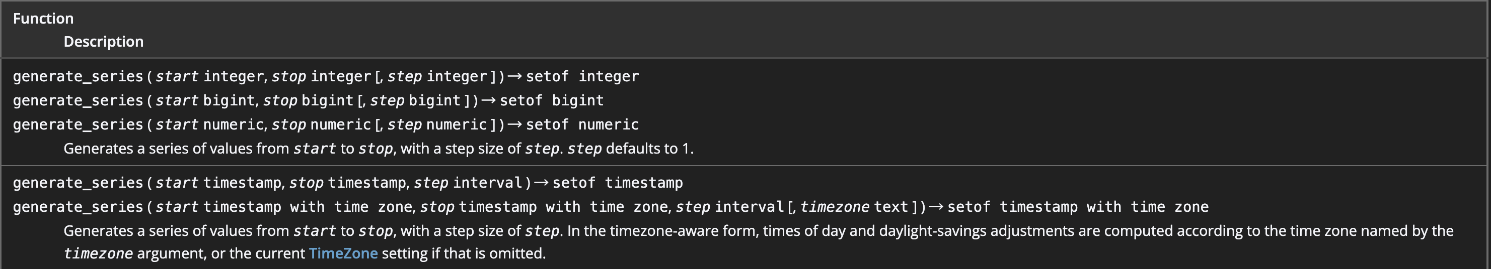 generate_series ( start timestamp with time zone, stop timestamp with time zone, step interval [, timezone text ] ) → setof timestamp with time zone