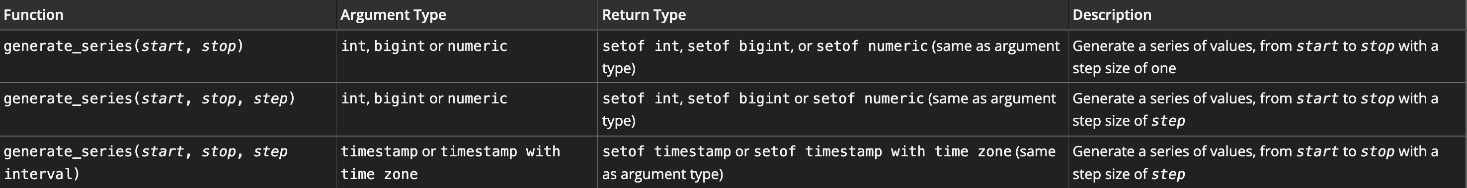 generate_series ( start timestamp, stop timestamp, step interval ) → setof timestamp