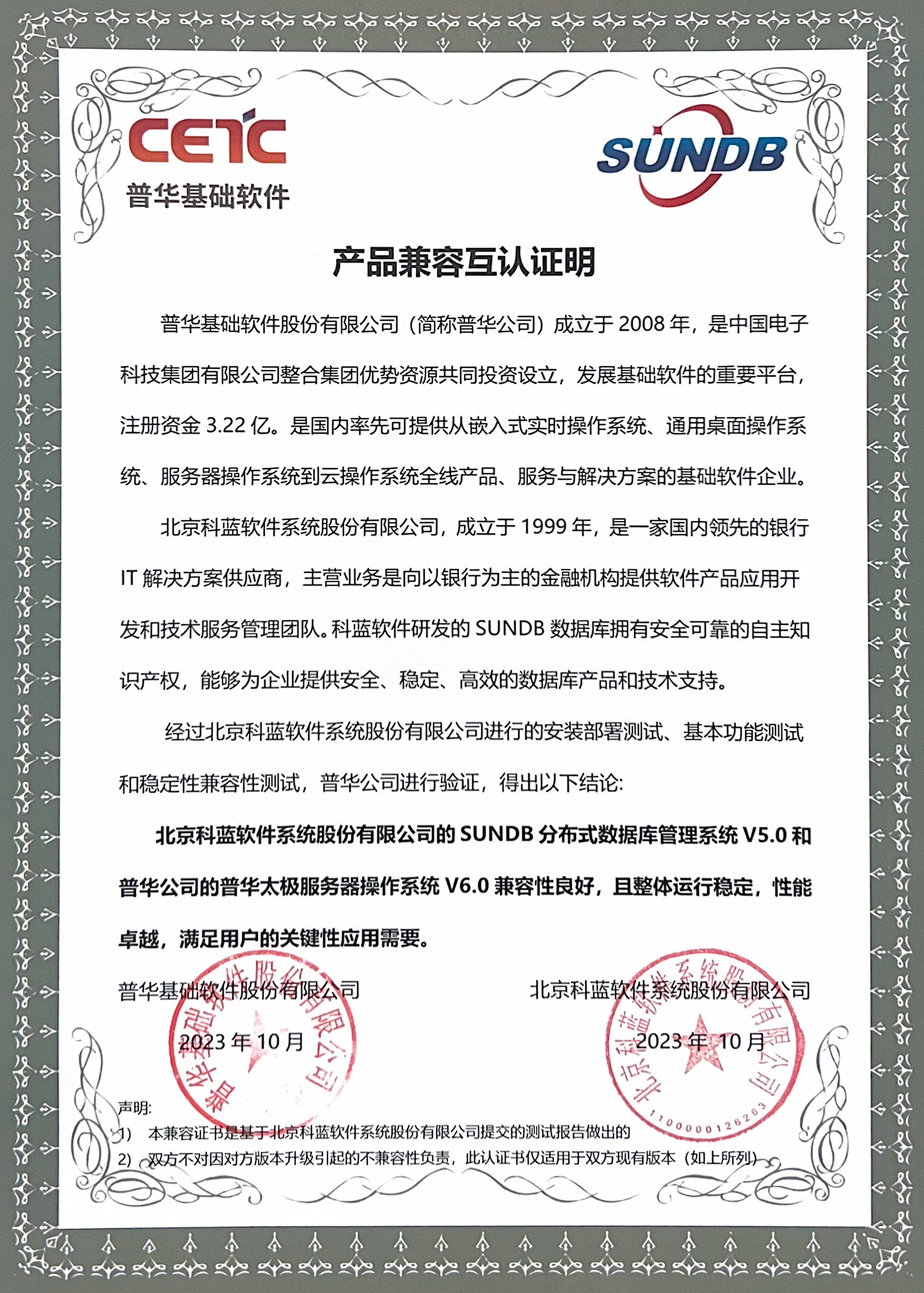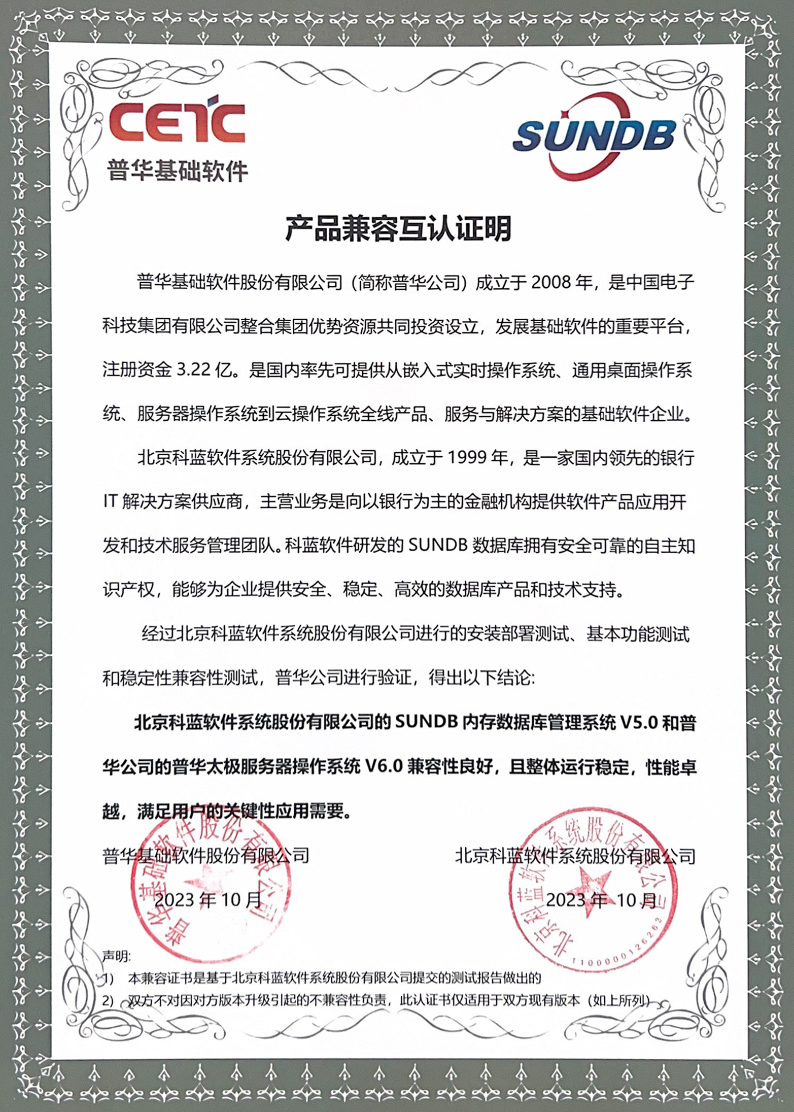 北京科蓝软件系统股份有限公司与普华基础软件股份有限公司完成产品互兼容适配认证。通过共同测试,科蓝软件SUNDB数据库管理系统V5.0、SUNDB分布式数据库管理系统V5.0、SUNDB内存数据库管理系统V5.0与普华太极服务器操作系统V6.0兼容性良好,且整体运行稳定,性能卓越,满足用户的关键性应用需要。