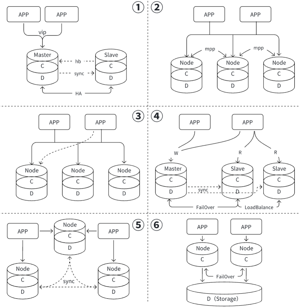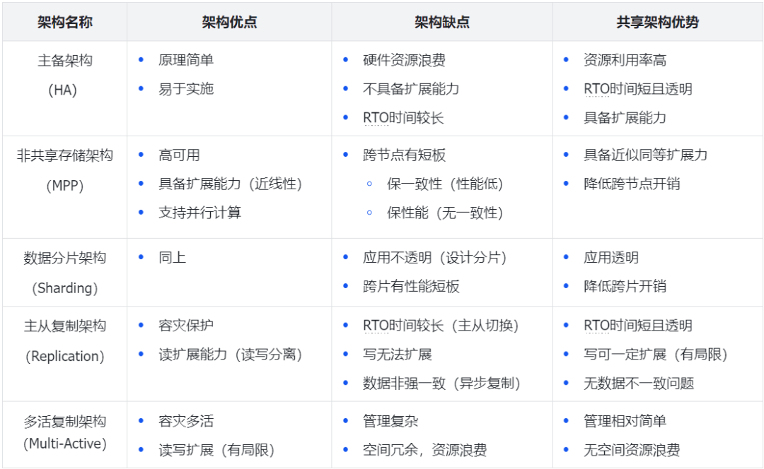 共享存储架构,对比于其他架构有着鲜明的特点,可以提供很好的高可用、高性能、可扩展和应用透明的特性。下图将针对常用的架构及与共享存储架构的对比来说明下。