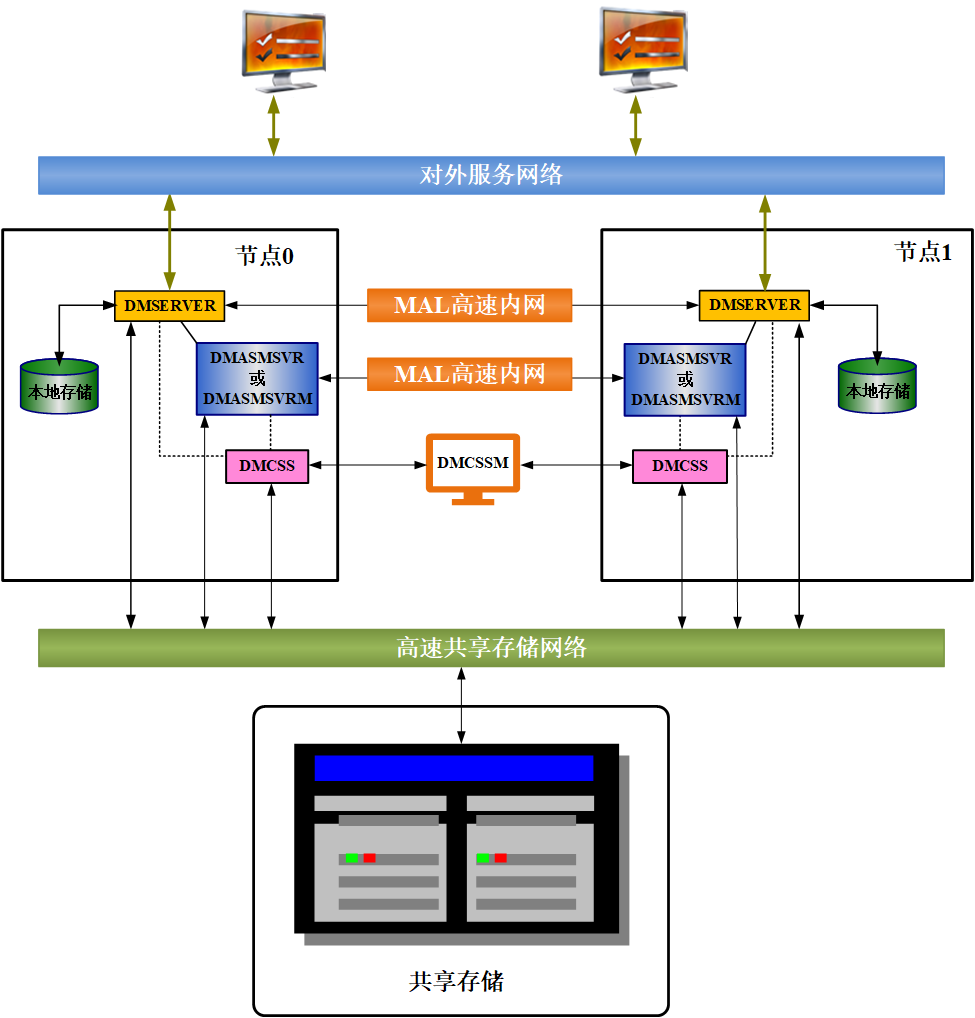 实例高可用-DMCSS,当出现系统故障、硬件故障、或人为操作失误时,DMCSS 可检测故障并自动将故障节点踢出集群,保证数据库服务的正常提供。故障节点的用户连接会自动切换到活动节点,这些连接上的未提交事务将被回滚,已提交事务不受影响;活动节点的用户连接不受影响,正在执行的操作将被挂起一段时间,在故障处理完成后,继续执行。当 DMCSS 检测到故障节点恢复时,自动启动节点重加入流程,将恢复的故障节点重新加入 DMDSC 集群,将集群恢复到正常的运行状态。 数据高可用-DMASM,如果 DMDSC 配置了 DMASM 镜像,镜像功能可提供多副本技术。当出现磁盘损坏或数据丢失时,系统无需人工干预即可利用其他镜像副本继续提供数据库服务,同时又可以自动或手动通过使用其他镜像副本进行数据恢复。
