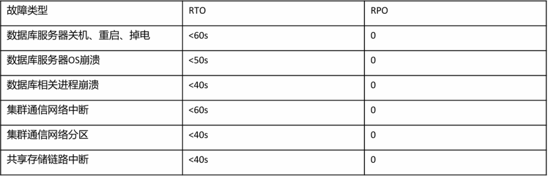 使用 KingbaseES RAC 可以在一定程度上避免因为硬件或软件故障引起的计划内或计划外停机,增加系统的可用性。KingbaseES RAC提供RPO=0,RTO<60s的可用性以及故障排除后的自动恢复能力。在2节点部署、200并发、负载均衡、多表2000行/s写入情况下,集群默认配置下RTO参考