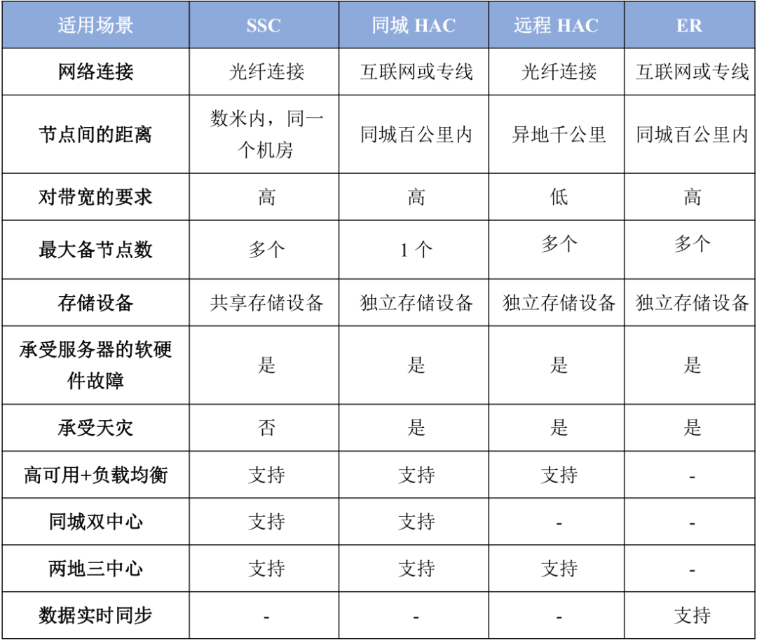 支持同机房共享存储(SSC)、主备高可用灾备(HAC)能力、异地灾备高可用(RHAC)能力。