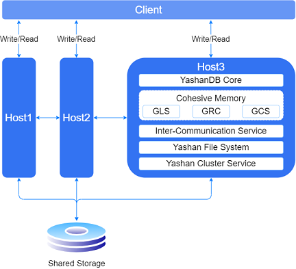 YashanDB共享集群依据YashanDB的数据库内核逻辑演进而来,并在共享存储的基础上引入了Cohesive Memory核心技术,用于集群数据库各实例之间协同数据页的读写访问以及各种非数据类资源的并发控制。其中,GRC( Global Resource Catalog )负责全局资源管理,GCS( Global Cache Service )负责全局数据页管理,GLS( Global Lock Service )负责全局锁管理。