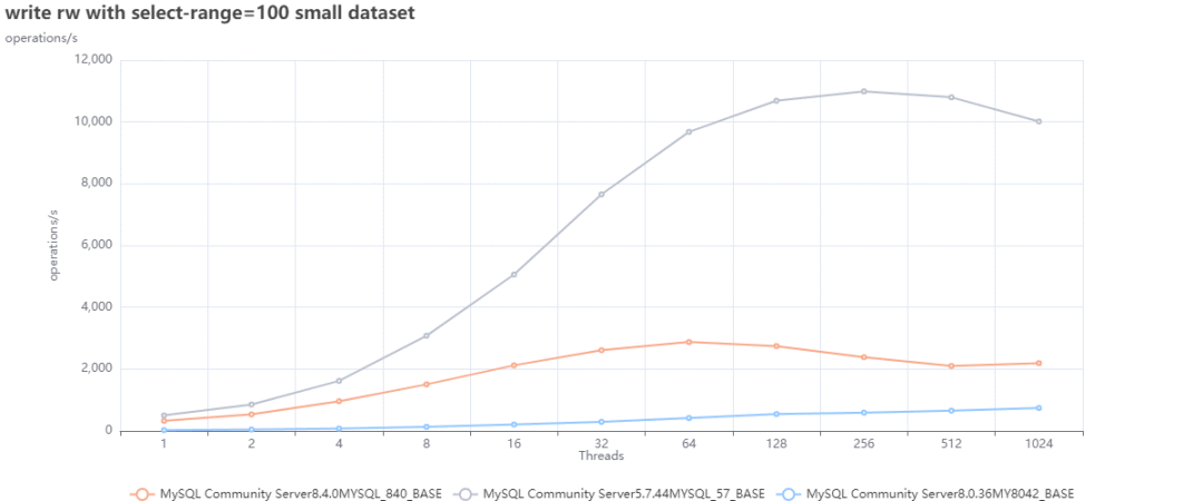 1.使用默认值的 MySQL 5.7 ,在两种情况(大小数据集)下的表现都更好。2.MySQL 8.0.36 因为默认配置参数不佳,使其在第一种(小数据集)的情况表现拉垮。但只要进行一些优化调整,就能让它的性能表现超过 8.4,并更接近 5.7。