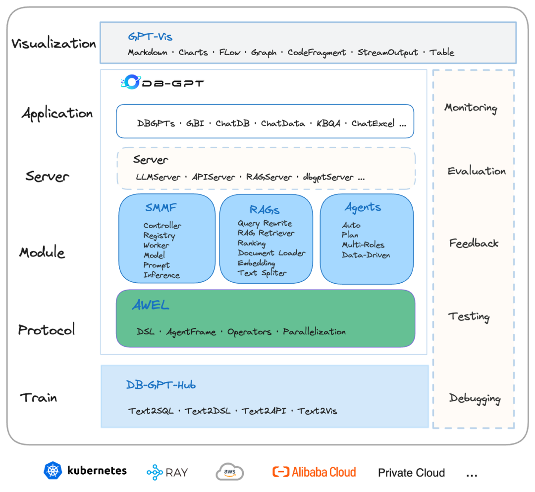 DB-GPT是一个开源的AI原生数据应用开发框架,目的是构建大模型领域的基础设施,通过开发多模型管理(SMMF)、Text2SQL效果优化、RAG框架以及优化、Multi-Agents框架协作、AWEL(智能体工作流编排)等多种技术能力,让围绕数据库构建大模型应用更简单,更方便。