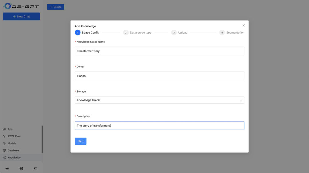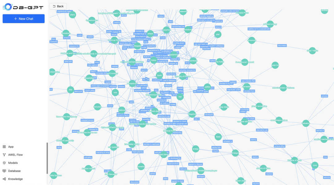 启动DB-GPT后,新增Knowledge Space,选择Knowledge Graph存储类型。上传tranformers_story.md后切片自动构建图索引。