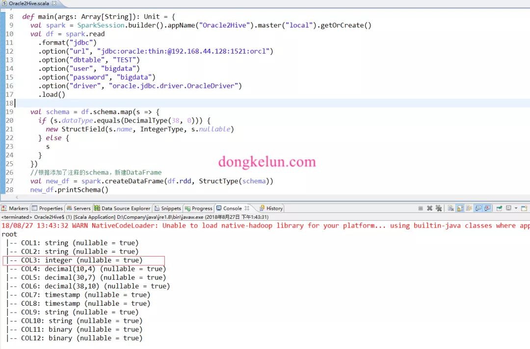 可以看到Spark成功的完成上述表格的字段类型转化,小数的精度和是否为空都可以获取到,但是不完美的一点是没有将NUMBER标度为零的转换为Int,而还是以DECIMAL(38,0)的形式表示,虽然都是表示的整数,但是在后面Spark读取hive的时候,还需要将DECIMAL转为Int。