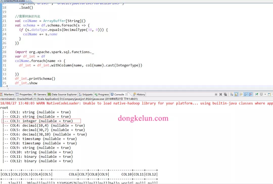 可以看到,已经成功的将COL3的字段转为了Int。但是这样构造的DataFrame是不能用的,如执行new_df.show会报如下错误: