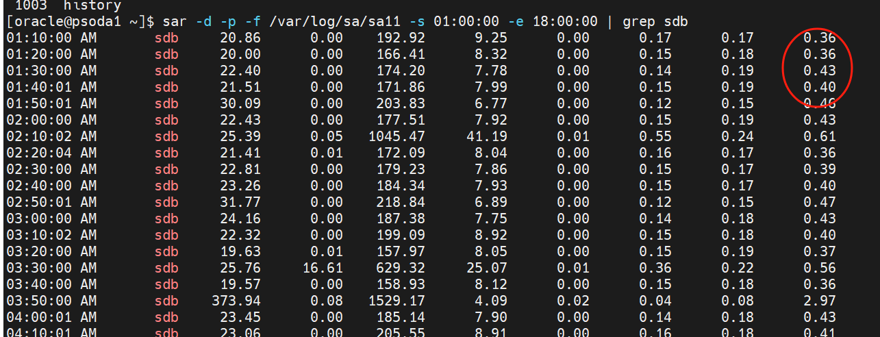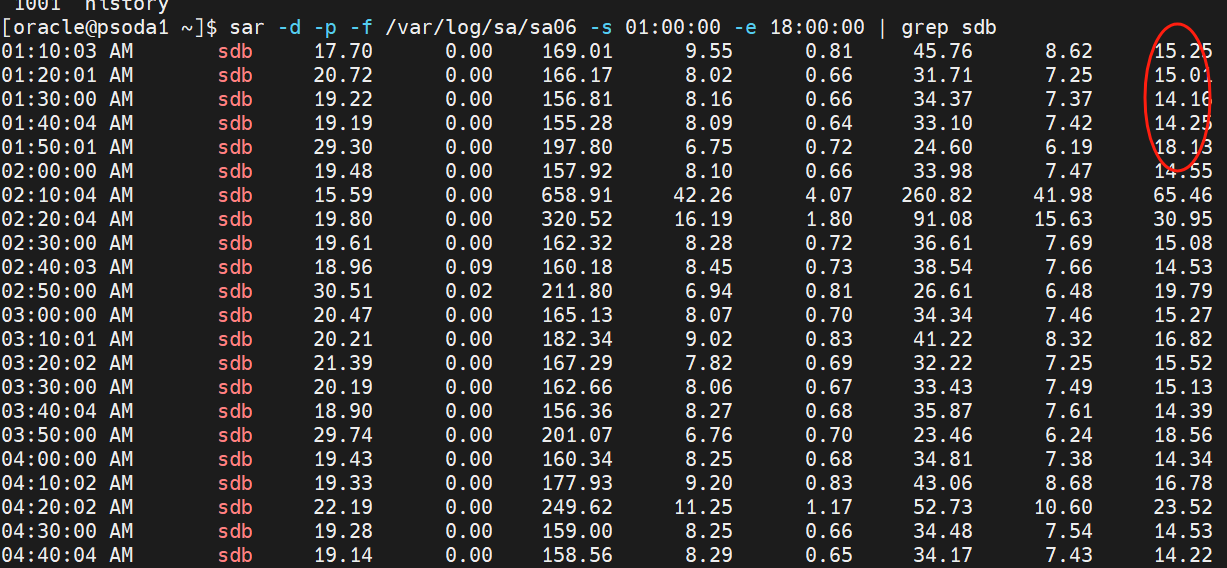 sar -d -p -f /var/log/sa/sa06 -s 01:00:00 -e 18:00:00 | grep sdb