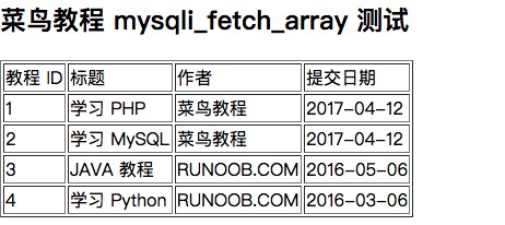 echo '<h2>菜鸟教程 mysqli_fetch_array 测试</h2>';