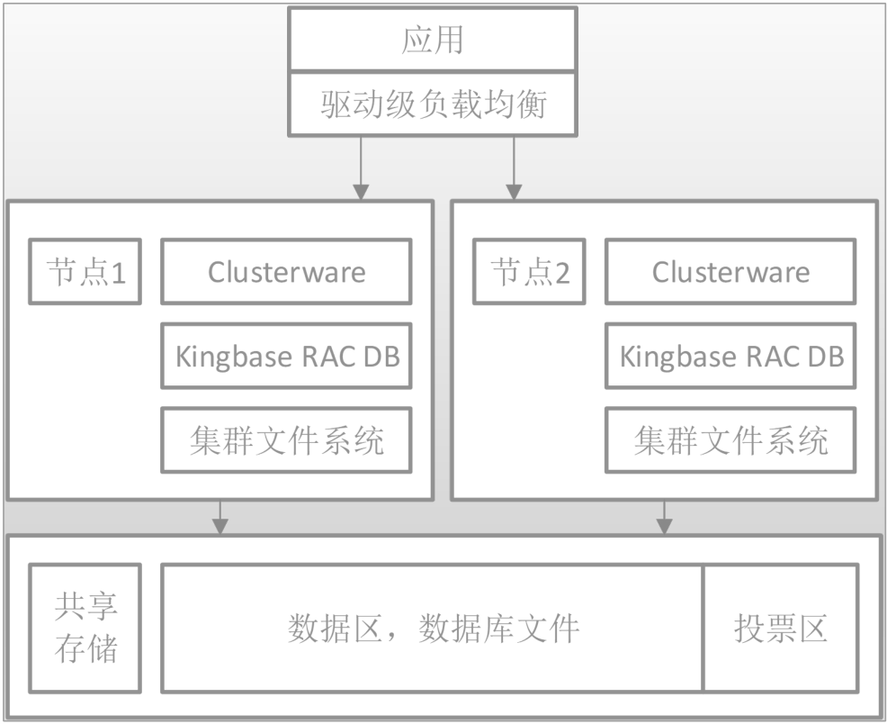 KES RAC 提供了数据库的连接驱动,实现了客户端的负载均衡。中间部分的集群管理软件-clusterware,提供集群成员管理,进行故障检测与处置。KES RAC 数据库提供跨节点一致的读写服务。集群文件系统支持各节点数据库对共享存储的一致性访问。