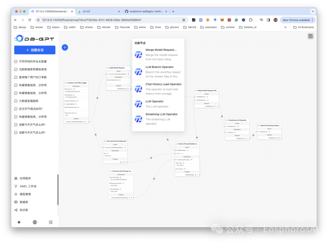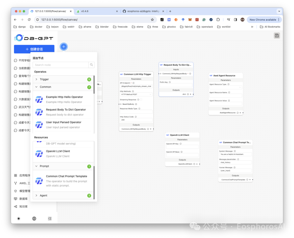 如下图所示,在左侧的菜单栏中,有 AWEL 工作流菜单, 打开之后可以进行工作流的编排。