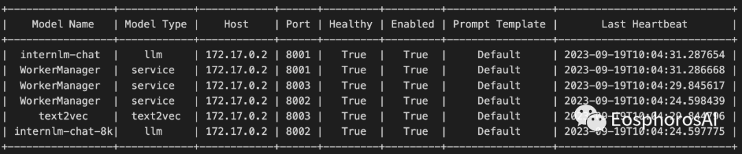 dbgpt start worker --model_name internlm-chat-7b-8k \--model_path app/models/internlm-chat-7b-8k \--port 8001 \--controller_addr http://127.0.0.1:8000dbgpt model list