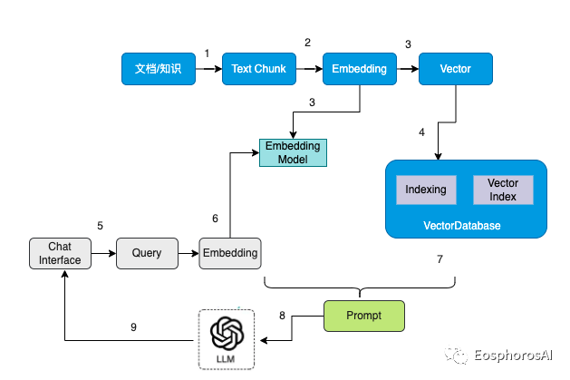 大模型时代外挂本地知识库的流程可以描述为如下所示,整个过程可以分为九个步骤:
