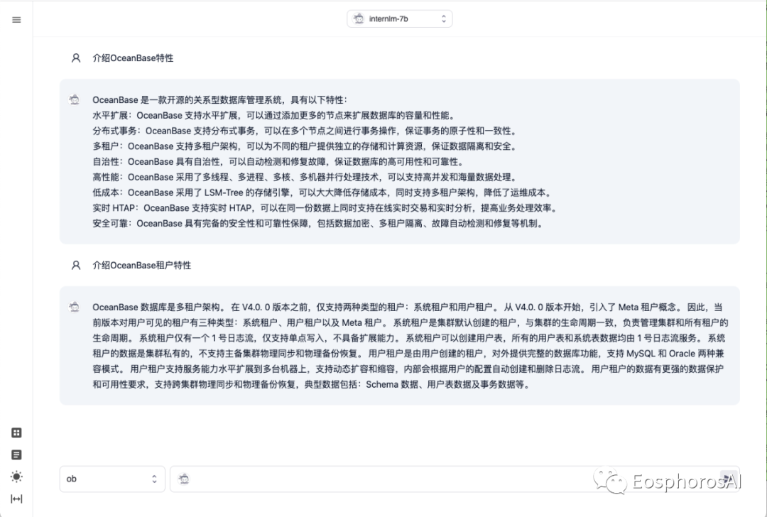 当我们将目光聚焦在围绕数据库与大模型构建海数精算,笔笔洞察的时候,发现面对私域知识与数据,还有非常多应试与感性的诉求。比如基于 DB-GPT 搭建一套自动出题与阅卷系统或者在吟诗作赋、对对联等符合人类道德与价值观以及微调后带有情感的回复能力,而这些正是 InternLM (书生·浦语)之所长。