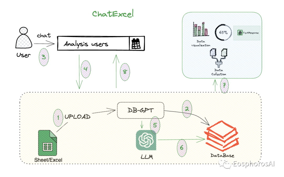 我们需要将Excel作为一个数据源上传到DB-GPT当中。 DB-GPT通过Excel Python支持特性将Excel表格数据转换为数据库表格,可以利用DB-GPT中的通用能力。 用户发起对话,通过对话进行Excel数据分析。 根据DB-GPT中ChatExcel场景逻辑,调用大模型生成对应的Text2SQL语句。 利用执行插件能力,执行具体结果。 收集数据绘制图表。 返回最终结果。