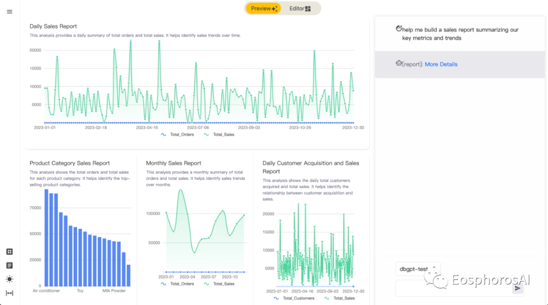 ChatExcel支持用自然语言分析和查询Excel表格数据。#495 新增DB编辑器功能,使用编辑器模式,你可以编辑SQL进行调试。#495 支持多数据源管理,用户可以连接MySQL, Sqlite, ClickHouse, DuckDB, Mssql等数据源。#495 新增bge Embedding模型。#479 Dashboard支持了Editor功能。#495