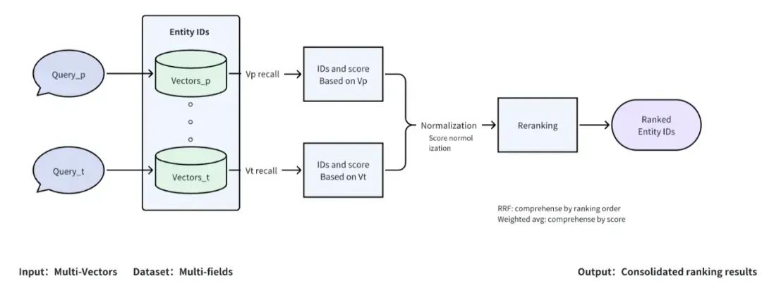 看到这些 Milvus 2.4 的新功能,我还是有些“手痒”的,很想体验一下多向量搜索的威力。多向量搜索的新特性主要是基于多模态的多向量搜索,本质是用两个不同模态的向量在 Milvus 中进行搜索。比如:先提取人员A的脸部照片向量、声纹向量,然后在 Milvus 中,把人员A的脸部照片向量在众多人员的脸部向量中进行搜索,并且把人员A的声纹向量在众多人员的声纹向量中搜索,最后根据设定的两个模态向量的权重,对两个向量搜索结果重新排序,这样得到的结果,要比单向量搜索的更加准确。