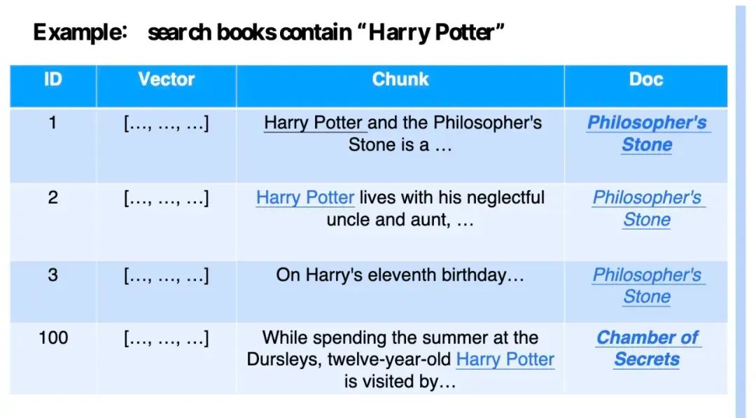 Milvus 2.4 的新增支持 Grouping 搜索功能,使得用户可以在搜索 vector 的基础上做分组聚合,返回的 TopK 是基于分组后的聚合结果而非简单的以向量为中心的片段信息。用户现在可以按特定标量字段中的值聚合搜索结果,这有助于RAG 应用程序实现文档级召回。考虑一个文档集合,每个文档拆分成各种段落。每个段落由一个向量嵌入表示,属于一个文档。要查找最相关的文档而不是分散段落,可以在 search() 操作中包含 group_by_field 参数,以按文档 ID 对结果进行分组。