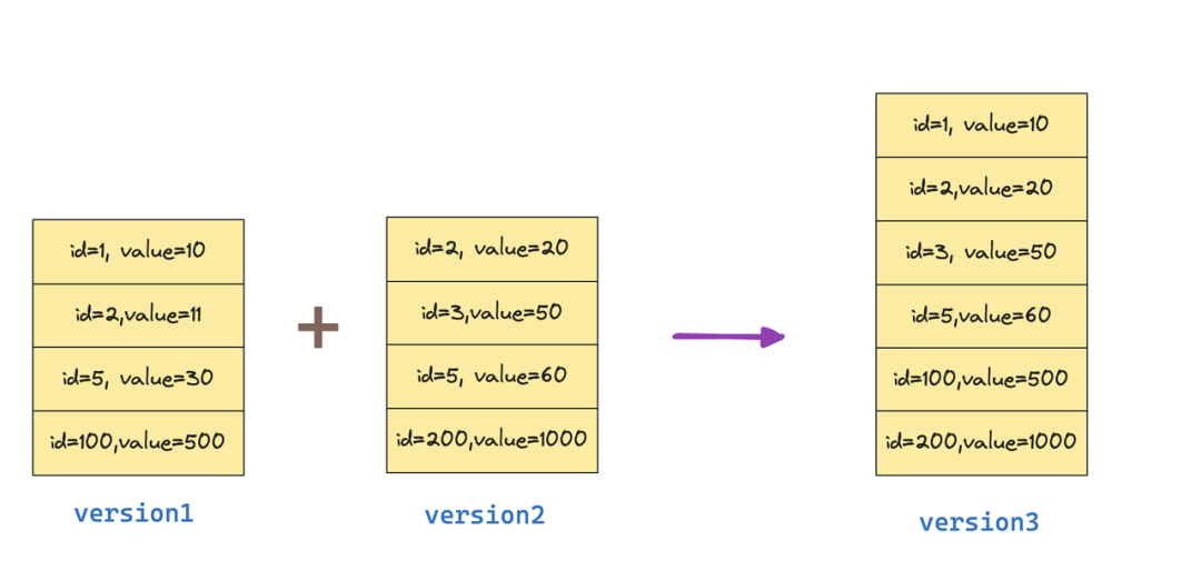 举个例子:下图中 version 1 和 version 2 数据文件进行 Compaction 后,消除了 version 1 中的旧版本数据(id = 2, value = 11, id = 5, value = 30),最终生成了新的数据版本文件 version 3。
