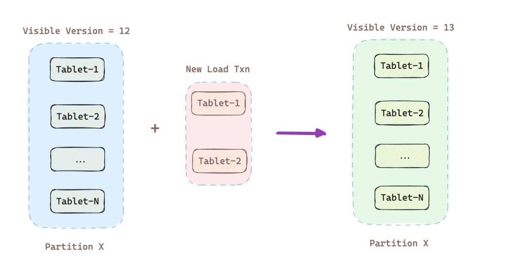 如前所述,每次导入都会在 FE 内生成一个新版本,而该版本被标记在 Partition 之上。一旦导入事务成功提交,便会更新 Partition 的可见数据版本号,Partition 的数据版本号单调递增。