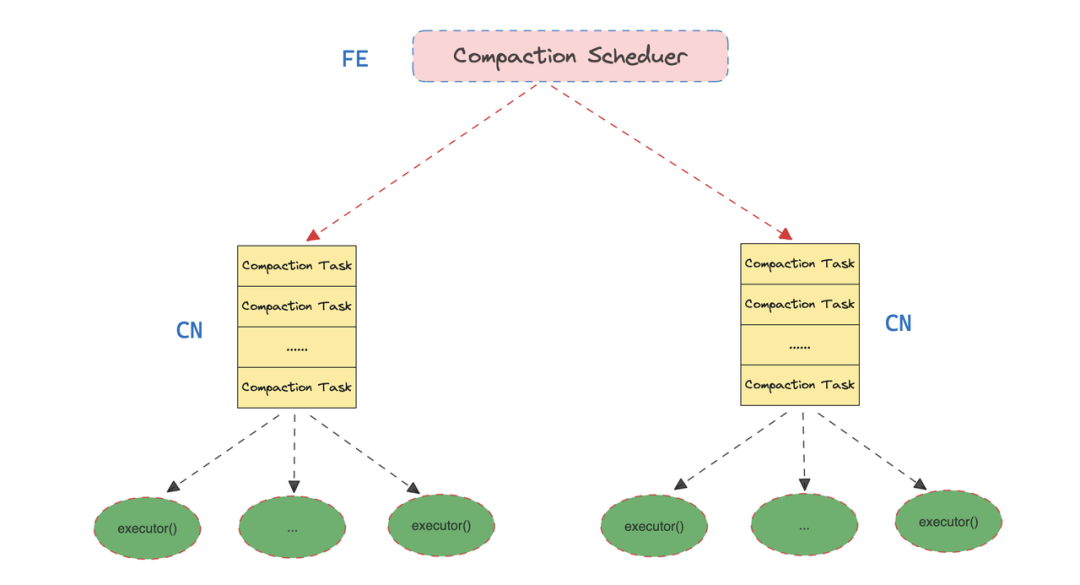 在 StarRocks 存算分离中,FE 作为 Compaction Scheduler,而 BE 或者 CN 都作为 Compaction Executor。每个 Compaction Executor 内都存在一个线程池专门用于执行 Compaction Job。