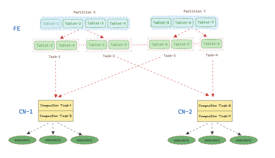 Partition X 内,Tablet-2 和 Tablet-4 位于相同的 CN-1,而 Tablet-1 和 Tablet-3 位于相同的 CN-2,于是为 Partition X 构造了两个 Compaction Task(Task-1 与 Task-2),其中 Task-1 内包含 Tablet-2 和 Tablet-4,而 Task-2 内包含 Tablet-1 和 Tablet-3。