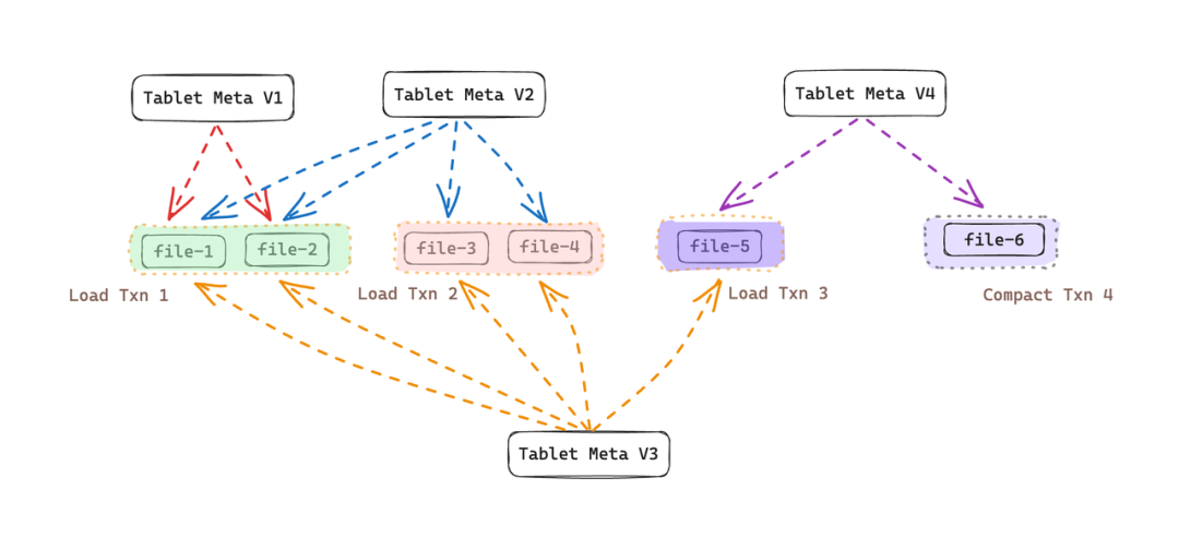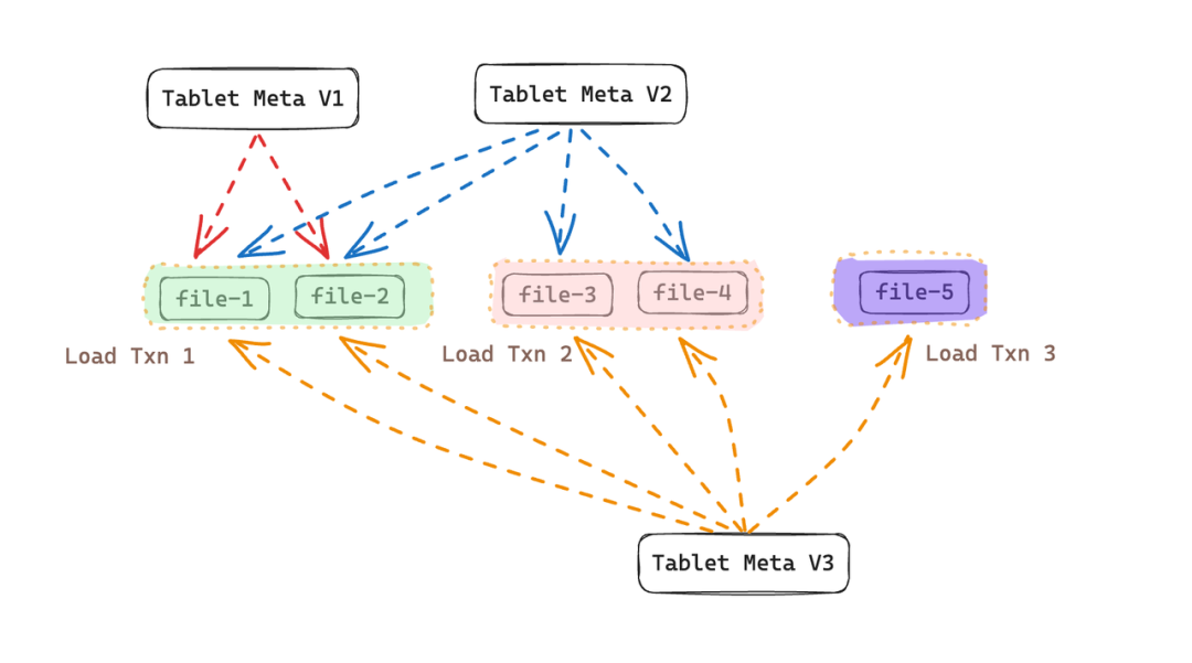 Load Txn 1: 在事务数据写入阶段,生成了新数据文件 file 1 & file 2,且该事务提交后生成了 Tablet Meta V1,其中记录该版本可见的文件列表为 {file-1, file-2} Load Txn 2: 在事务数据写入阶段,生成了新数据文件 file 3 & file 4。在提交时,根据前一个版本(即 Tablet Meta V1)然后加上本次导入事务生成的新数据文件(file-3 & file-4),生成了新的 Tablet Meta V2,因此,该版本可见的文件列表为 {file-1, file-2, file-3, file-4} Load Txn 3: 在事务写入阶段,产生了新数据文件 file 5。该事务提交时,根据前一个版本(即 Tablet Meta V2)然后加上本次导入事务生成的新数据文件(file-5),产生了新的 Tablet Meta V3,因此,该版本的可见文件列表为 {file-1, file-2, file-3, file-4, file-5}