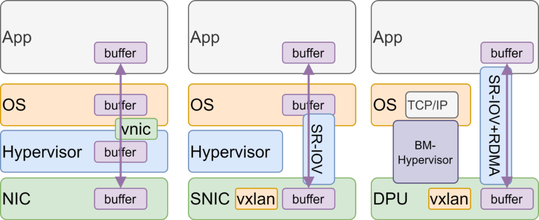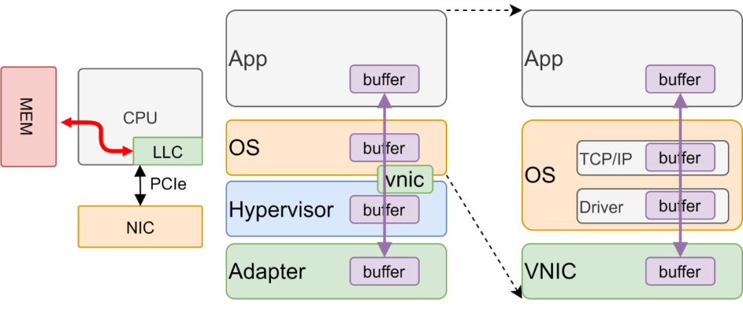 工业界的解决方法就是非常简单的做“双减", 一方面是使用SR-IOV来bypass hypervisor层,并且把vswitch的一些功能做到网卡上,另一方面是在GuestOS使能RDMA实现Kernel bypass