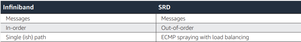 RDMA的问题正如AWS在实现SRD里指出的,它不满足交换律。而简单的内存读写操作是满足幂等的,至于结合律取决于这个操作里的幺元是什么,也就是说是以消息为原子,还是以Byte为原子进行操作,因为内存例如 Write 和 Read之间操作的地址空间有冲突则不满足结合律了,而消息的语义则很好的隔离开了这两者,其实这就是AWS实现SRD从数学上的解释,但是AWS也有没做好的地方,既然是MPI超算的业务,针对Reduce-Scatter这些语义的Offload没有考虑,无法直击最大的痛点(NetDAM一开始设计的时候就考虑到了),另一个是多路径只是简单的ECMP,事实上Segment Routing能够进一步解决这个问题。