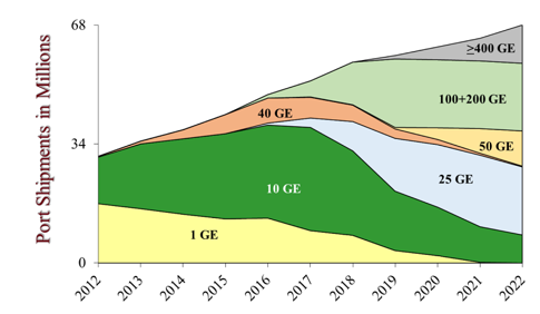 下图可以看到以太网接口速率的交货量,未来几年200GE和400GE会很快到达主机,但是主机的I/O准备好了么?
