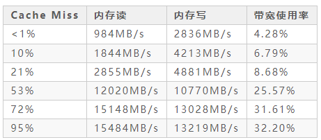 测试结果来看峰值带宽在应用正常随机读写时只有89GB/s了. 标准的100Gbps DMA的内存读写开销为24GB/s,也就是说当上到400GE时光DMA就把主内存带宽全吃光了...虽然Intel有DDIO一类的技术来缓解DMA的内存,我们也做了一些测试,如果Cache密集型的应用会轻易的导致DDIO失效,数据包将会从Cache内flush out到DMA,然后过一会儿又Read进来,所以在不同的CacheMiss Rate下,基本上可以看到10%的Cache Miss Rate就要消耗6.8%的内存带宽,而当400GE到来时差不多1/3的带宽也被I/O给浪费了。